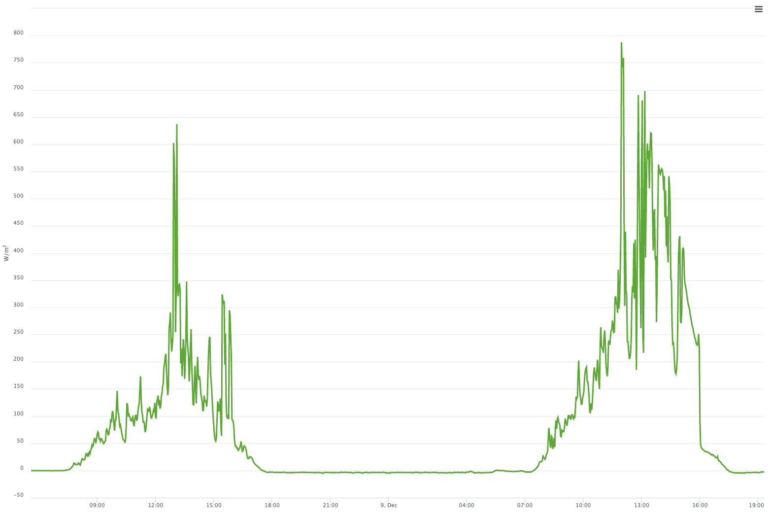 In our experience, satellite irradiance data is accurate to about 3% to 5% on a monthly basis. On a daily basis, the error bounds are around 20%. Side-by-side comparisons with on-site sensors show this clearly: clear days track closely, while cloudy days show significant smoothing and estimation errors.